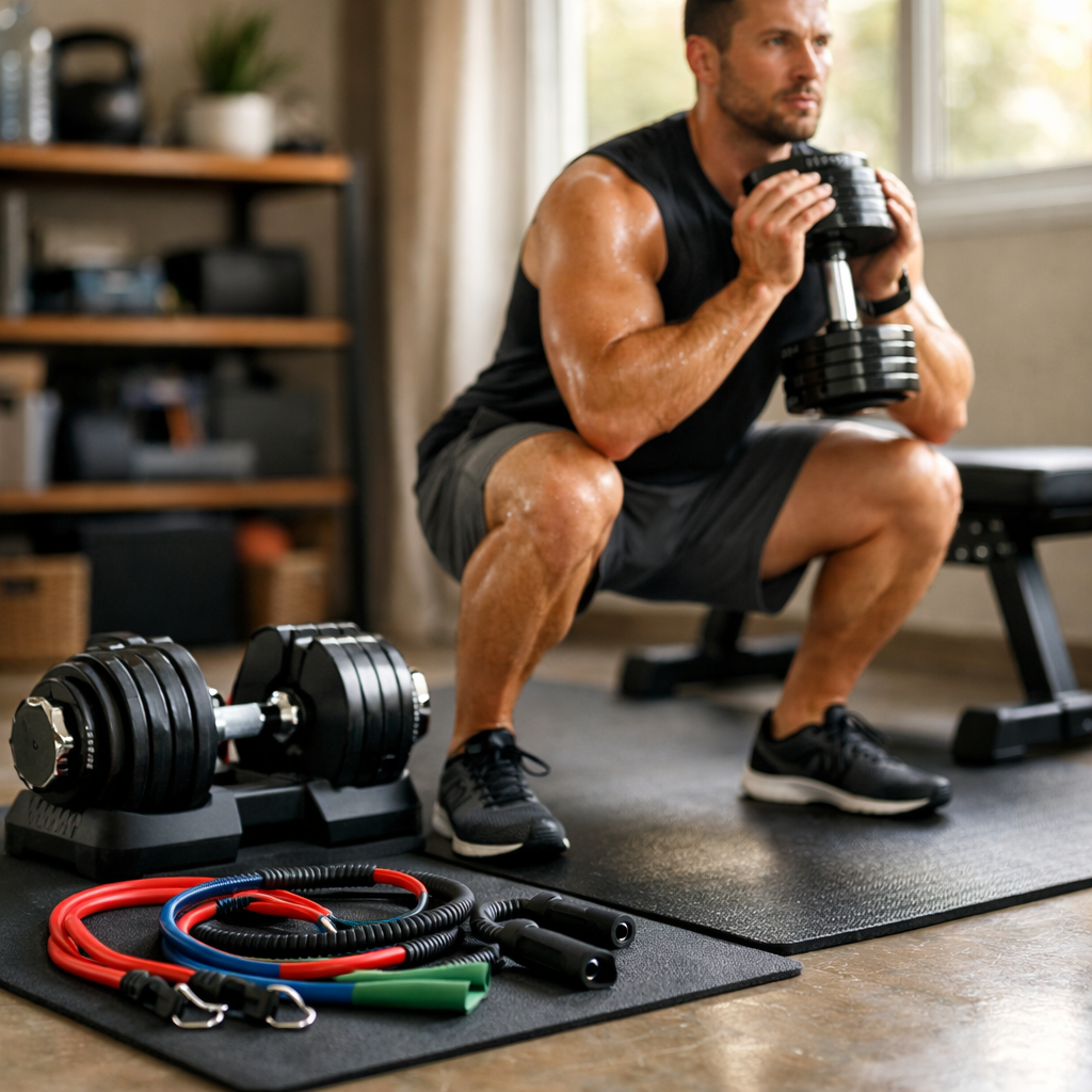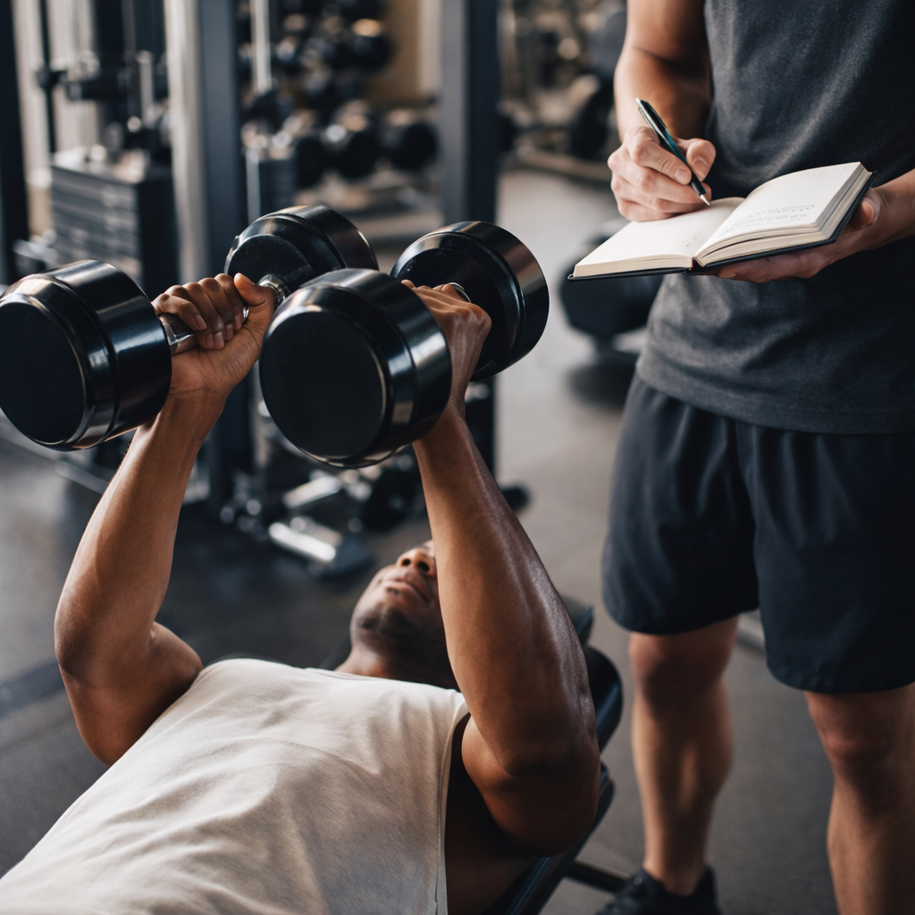 Use dumbbells, single-leg work, tempo, pauses, and higher reps to make lighter loads challenging. Pair movements efficiently: split squats, RDLs, presses, rows, pull-up variations, and loaded carries. Track reps and sets carefully so progression remains objective.